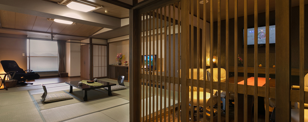 当館のお風呂は、大浴場も露天風呂も「畳風呂」なんです! 思わず寝ころびたくなるような優しい肌ざわりで、滑る心配もないので小さなお子様やお身体が弱い方も安心してお楽しみいただけます。