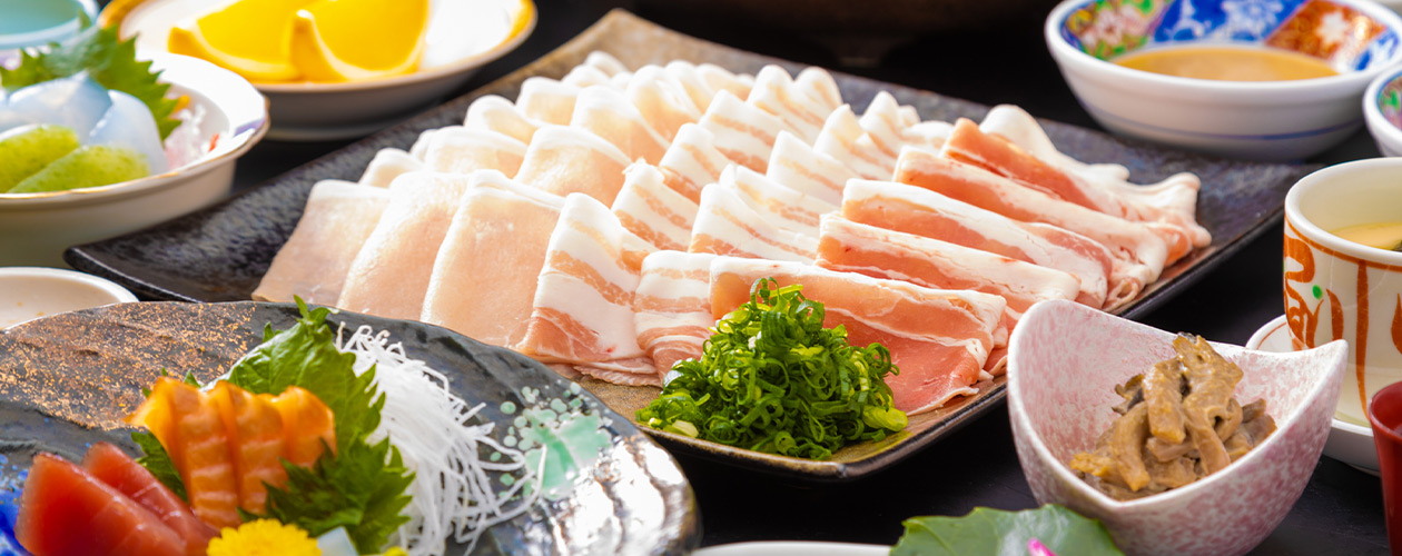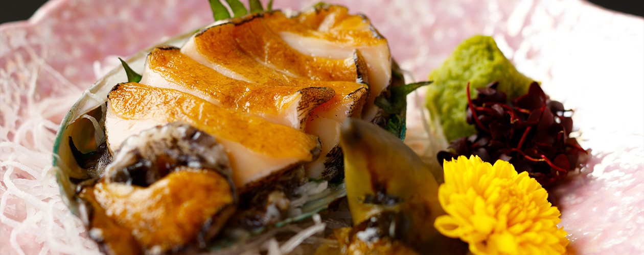 大人気の豚のしゃぶしゃぶ、驚くべきはお肉の量「一人前300g」。 まさに”メガ”しゃぶ!!お客様に大好評の「活鮑の踊り焼き」もインパクト大です!