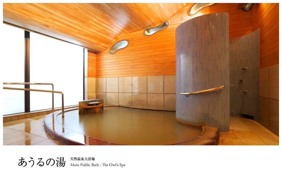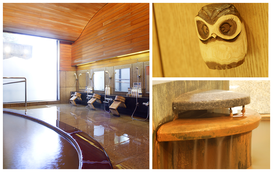 湯縁に金古木漆を塗られた大浴槽のふくろうは